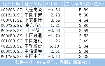 复牌后即遭遇连续四个跌停的大连电瓷(002606.SZ)今日跌幅收窄,主力资金大面积抛售,净流出额高达5.89亿元。金融板块领跌两市,相关个股亦成为主力出逃重点,中国平安(601318.SH)、平安银行(000001.SZ)、中信证券(600030.SH)分别净流出5.36亿元、4.54亿元、2.34亿元。中国联通(600050.SH)、中国建筑(601668.SH)、中国中车(601766.SH)净流出额分别为2.52亿元、2.49亿元、2.32亿元。