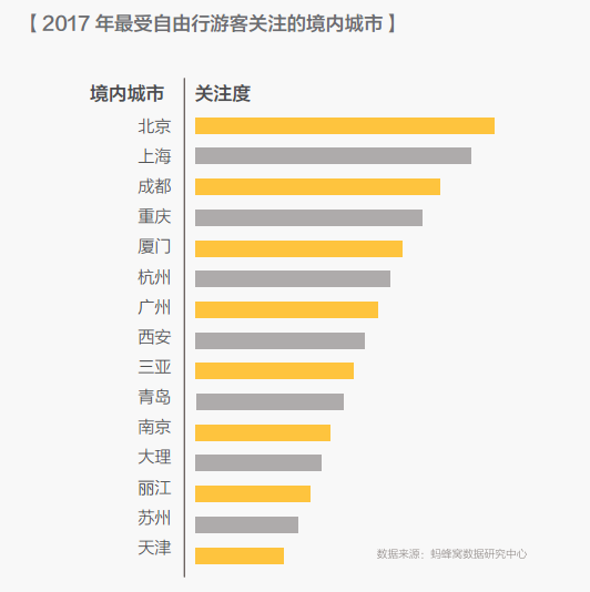 《报告》显示,2017年最受自由行游客关注的境内城市前五位分别为北京、上海、成都、重庆、厦门。