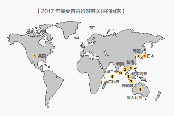 而最受自由行游客喜爱的境外目的地仍以短途目的为主,前两位是日本和泰国,韩国游的热度大幅下降,同样距离相近、性价比更高的东南亚国家如新加坡、越南的热度有所提升。远途境外目的地中,美国、澳大利亚最受欢迎。