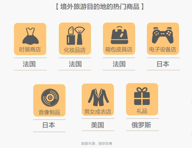 自由行游客在各个国家购物消费时,关注的购物场所和商品均有所不同。自由行游客会在英国法国的百货店购买珠宝首饰、服饰鞋履,在澳大利亚的免税店购买绵羊油、雪地靴等,在美国折扣店购买打折的奢侈品,在日本购买电子设备和音像制品。