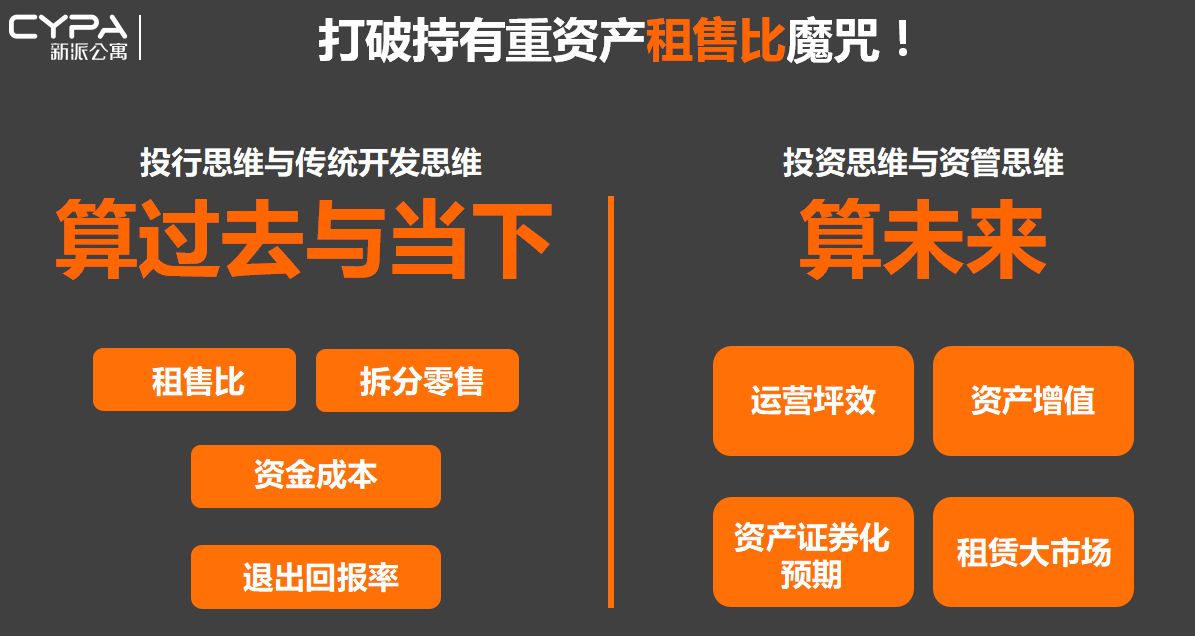 因此,王戈宏说,抱着投行思维和传统开发思维的人注定干不了长租公寓这事,因为只算当下,一算租售比肯定算不过账来;一定要有投资思维与资管思维的人才能干。新派CBD国展店4年资产净增值3倍(单价从2.2万/平米涨到现在的9万/平米左右)很难复制。可是如果思维变了,账还是可以算的。
