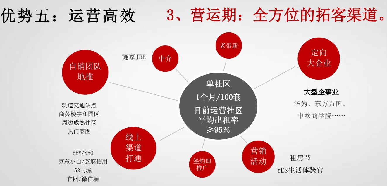其次,旭辉充分发挥自身供应链和复杂项目管理经验优势,实现了四两拨千斤的效果。装修上,旭辉领采用了地产成熟的PMO项目管理的模式,专门成立了一个PMO小组,以便能够循环和快速决策。同时配合充分的前期勘察(对于外部拿的房,PMO小组成员特别是工程设计都会介入到投资阶段),以及产品标准化,3个月能完成200间房的装修。出房上,通过人海战术,能做到5.5间/天的出房速度,而成本却没有显著的增加。