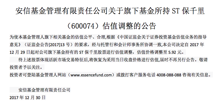 又一颗雷被公募基金引爆。12月30日,安信基金发布公告称,将对公司旗下基金持有的ST保千里(600074)股票进行估值调整,估值价格调整为5.92元。