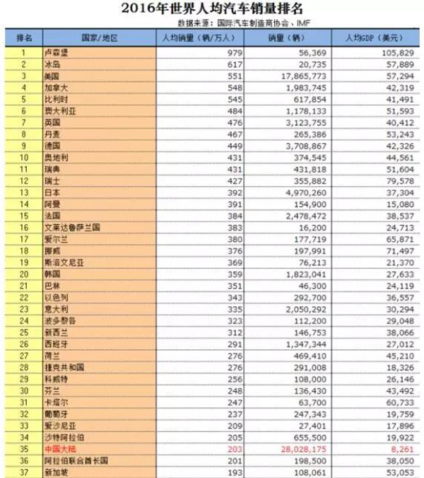 从上表可以看出,人均汽车销量高的基本是人均GDP达二三万美元的国家,只有中国这个8000多美元级别的国家加了进来。