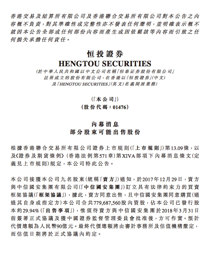 1月2日,在港交所上市的恒投证券(又名“恒泰证券”,01476.HK)发布公告称,公司九名股东将向中信国安集团出售价值90亿元的股份。