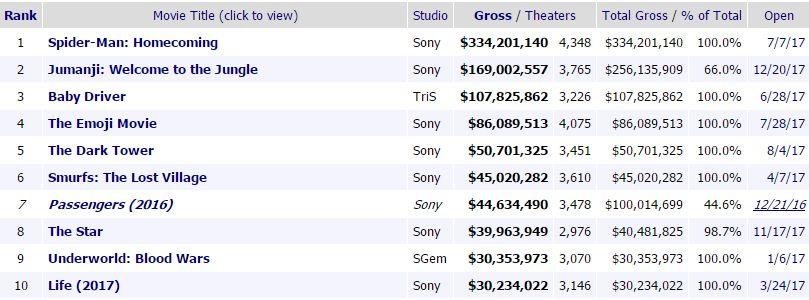 《蜘蛛侠:英雄归来》去年全球8.8亿美元,北美3.342亿美元,占到索尼全年业绩的几乎一半,从Box office mojo上显示的索尼2017年出品发行影片的北美票房排行榜上看,在2017自然年仅上映11天的《勇敢者游戏:决战丛林》就以1.69亿美元排在第二,《极盗车神》1.08亿排在第三,《黑暗塔》、《异星觉醒》、《表情奇幻冒险》、《太空旅客》、《银翼杀手2049》等多部上映前备受期待的影片,纷纷在票房榜上折戟,全球、北美票房皆不尽人意。