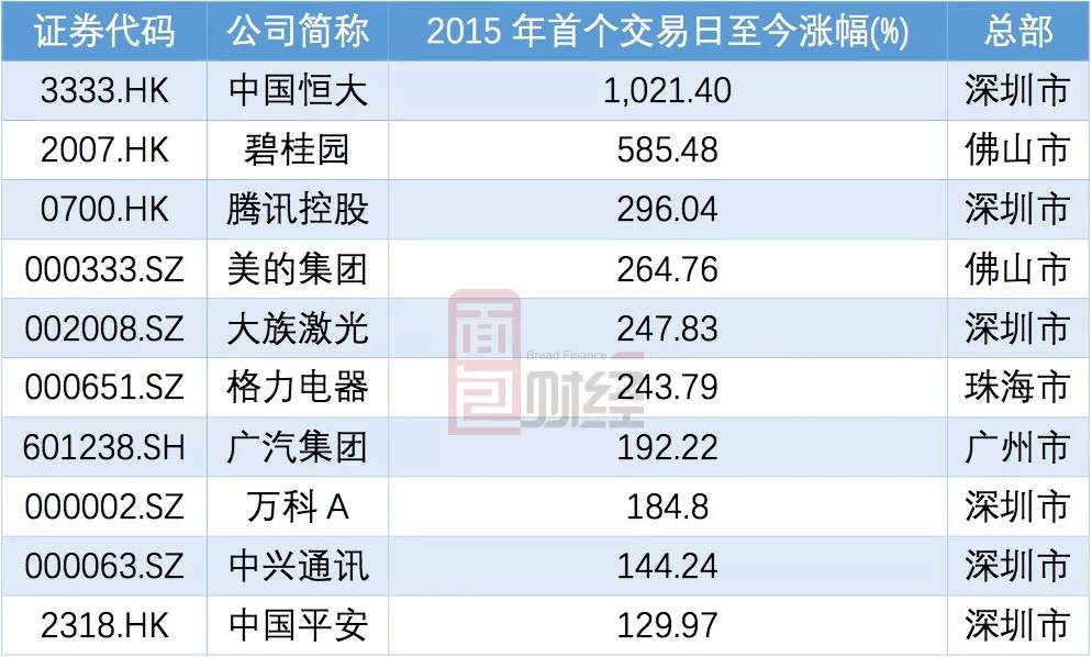 从2015年第一个交易日至今,涨幅榜前十名,竟然有五家是总部位于大湾区的公司!比例远大于其他区域,其中有三家公司总部在深圳,这些公司涨幅均超过4.6倍。
