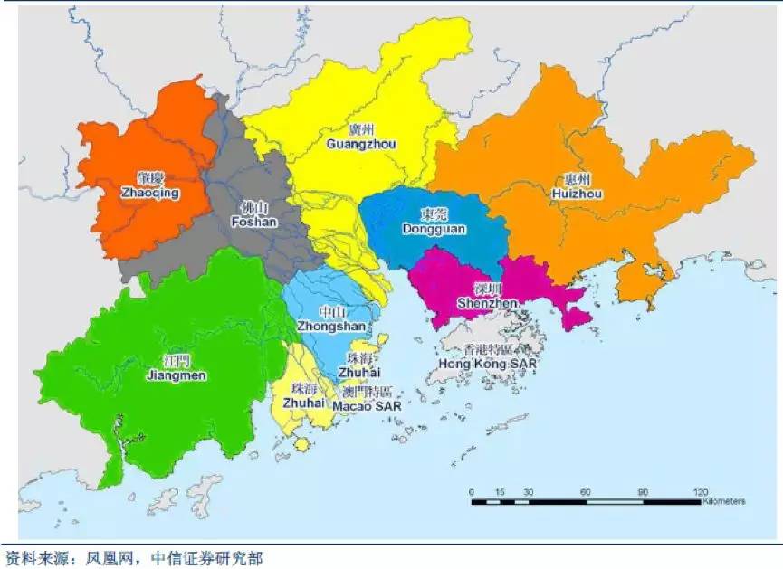 粤港澳大湾区指的是“九市两区”——广州、深圳、珠海、佛山、惠州、东莞、中山、江门、肇庆这九个位于广东省的城市,以及香港和澳门这两个行政特区。