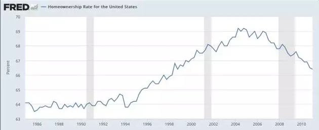▲1985年~2010年美国住房自有率走势(来源:圣路易斯联储)