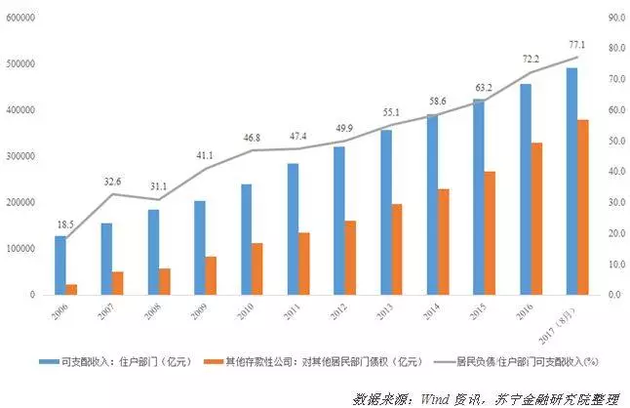 据苏宁金融研究院表示,相较于居民杠杆率这样的宏观指标,债务收入比更能衡量一个家庭的负担程度和家庭债务风险。Wind数据显示,中国居民部门债务占居民可支配收入的比重,从2006年时的18.5%暴涨至2017年8月的77.1%。