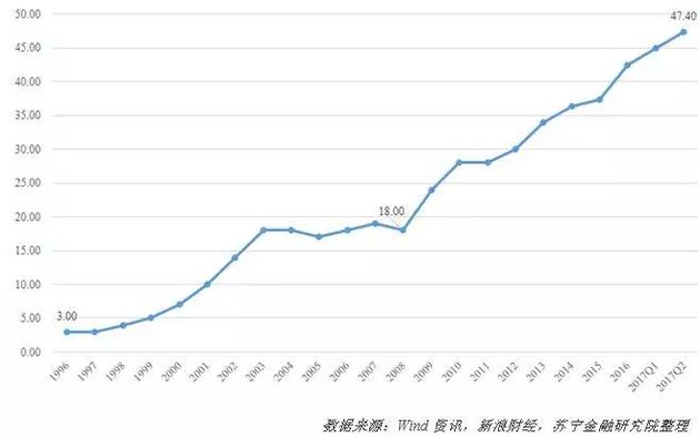 居民杠杆率,是指居民部门债务占GDP的比重。1996年中国居民杠杆率只有3%,2008年也仅为18%,但是自2008年以来居民杠杆率开始呈现迅速增长态势,短短六年间翻了一倍,达到36.4%。到了2017年三季度居民杠杆率已经高达48.6%。