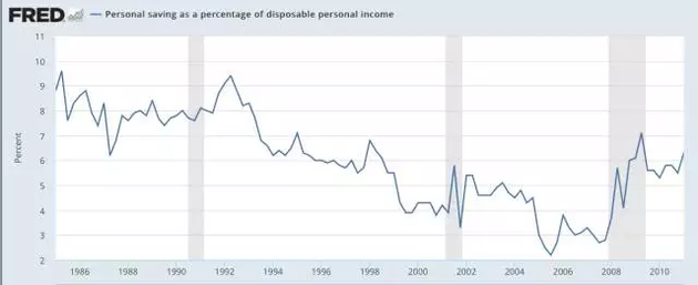 ▲1985年~2010年美国人可支配收入存款率走势(来源:圣路易斯联储)
