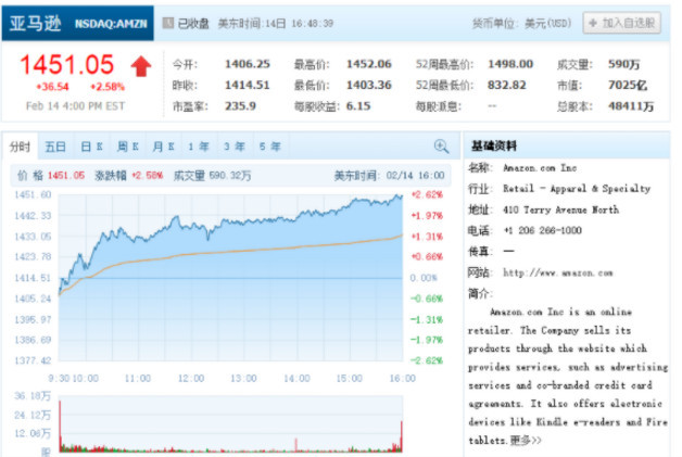 亚马逊股价周三上涨2.6%,报收于1451.05美元;市值达到7024.6亿美元,较上一交易日增加了176.9亿美元。微软股价周三则上涨1.6%,市值达到6992.2亿美元,较上一日交易日增加107.8亿美元。亚马逊市值在2月7日的盘中交易中曾短暂超越微软,但在收盘时又再次居微软市值之下。