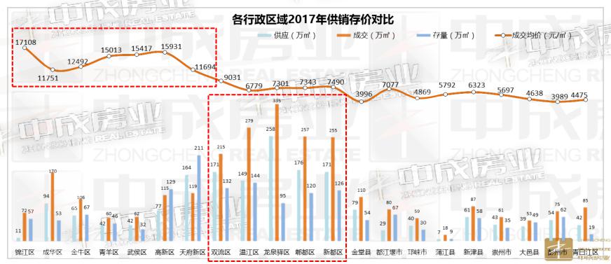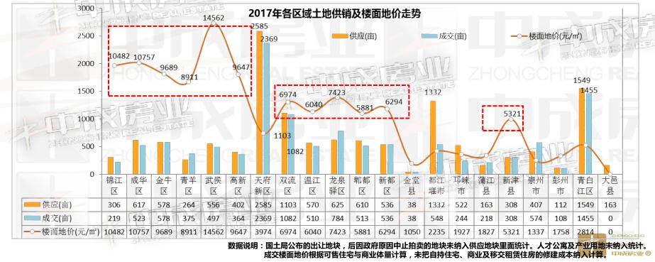 中成房业2017年年报数据显示,2017年新津、青白江,以及彭州三个区域土地供销基本持平,呈现出旺盛的需求状态。其中,彭州供应量在远郊区域中最低。尤其值得注意的是新津,尽管供应量比都江堰和青白江差了一大截,却以楼面地价达到5321元/㎡直逼近郊的郫都。