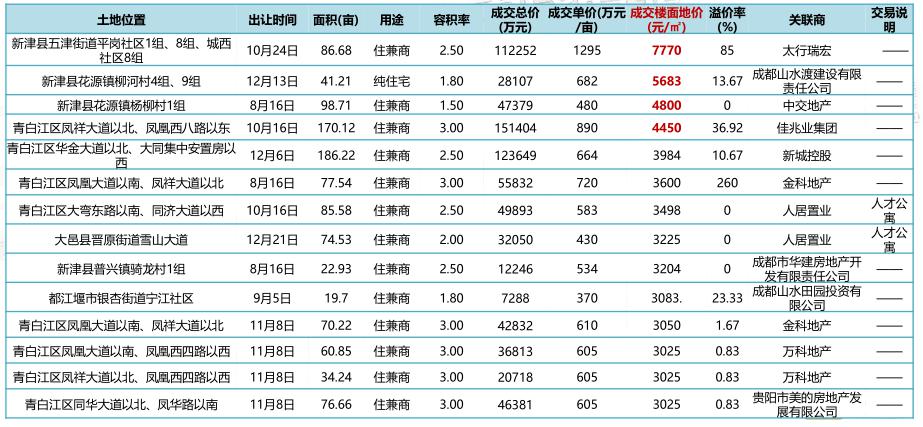远郊单宗地块的楼面价最高价就出自新津。由太行瑞宏拿下的86.68亩地块创造了新津的最高楼面价7770元/平方米,与近郊区域相当。综合远郊区域成交代表地块,新津和青白江可以说是平分秋色,虽然青白江占了量的优势,但在地价上新津占据了绝对领先的地位。