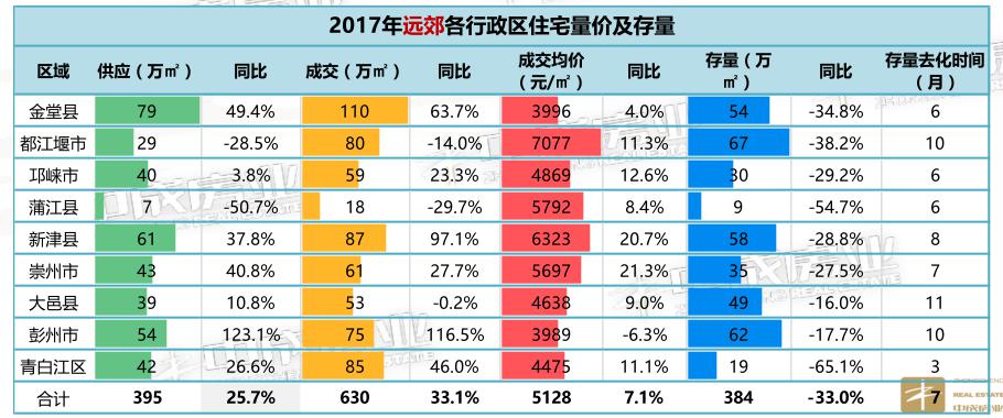 受积压下来的高库存影响,新津的去库存时间仍需要8个月,但新津整体已经明显表现出供销两旺的态势,供应量和成交量双双排第一,且价格仅次于都江堰位居第二。