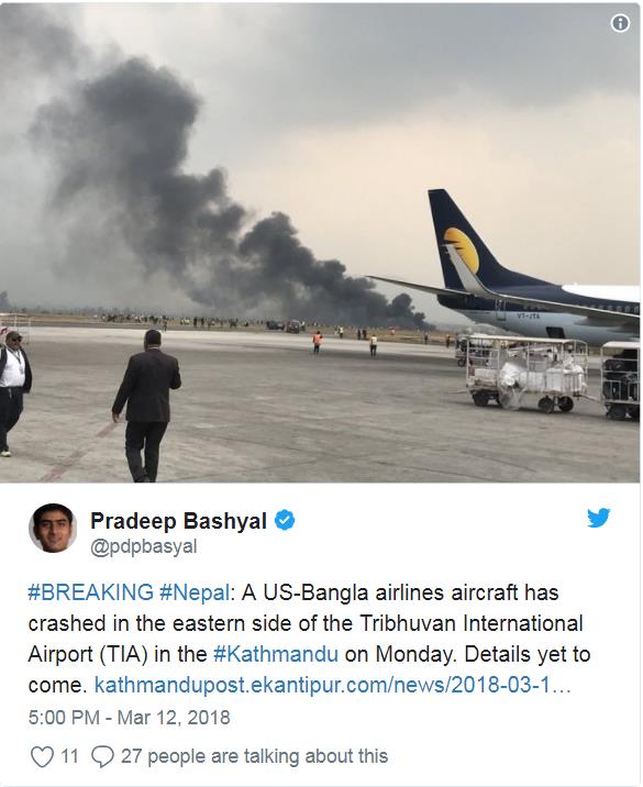 这架飞机属于孟加拉国私营航空公司US-Bangla Airlines,当地时间下午2:15在特里布万国际机场跑道着陆时起火。机场已经取消了全部起降航班。