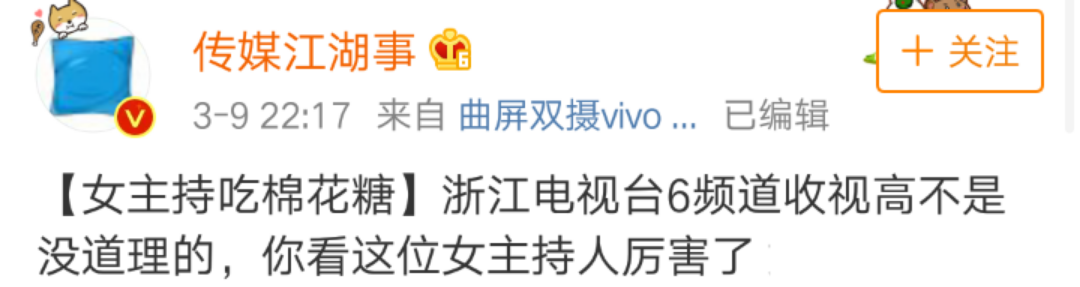 最近浙江台一位女主持火了,原因很特别,吃棉花糖...快到让人花了眼。