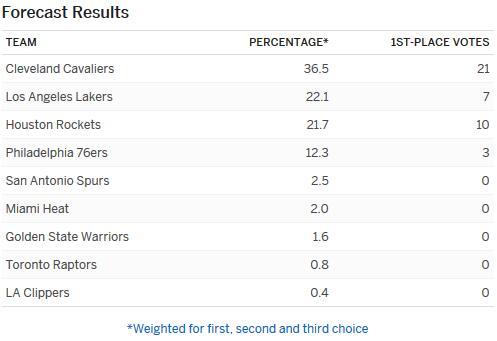 数据网站FiveThirtyEight给骑士的2017-18赛季夺冠概率为3%,而ESPN给出的数据则是惊人的0.2%。即使骑士能在季后赛脱胎换骨,专家们仍然不看好他们能在本赛季夺冠。