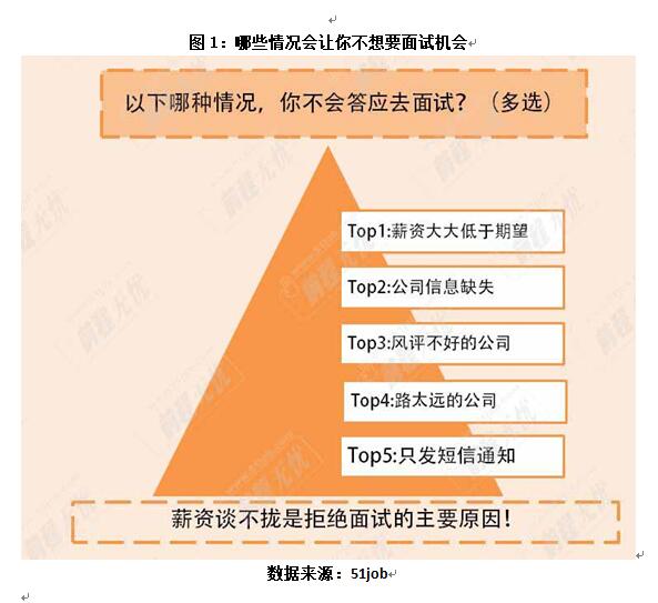 没面试,盼面试,有面试,却不想去,这是出了什么状况?日前,前程无忧在网上发起了《个人面试行为习惯》大调查,调查显示:“薪资谈不拢”、“公司本身信息缺失”、“风评不好”、“路程太远”和“公司只发短信通知面试”这五个情况成为个人有面试机会却不想去的主要原因。其中薪资达不到期望是首因。(见图1)
