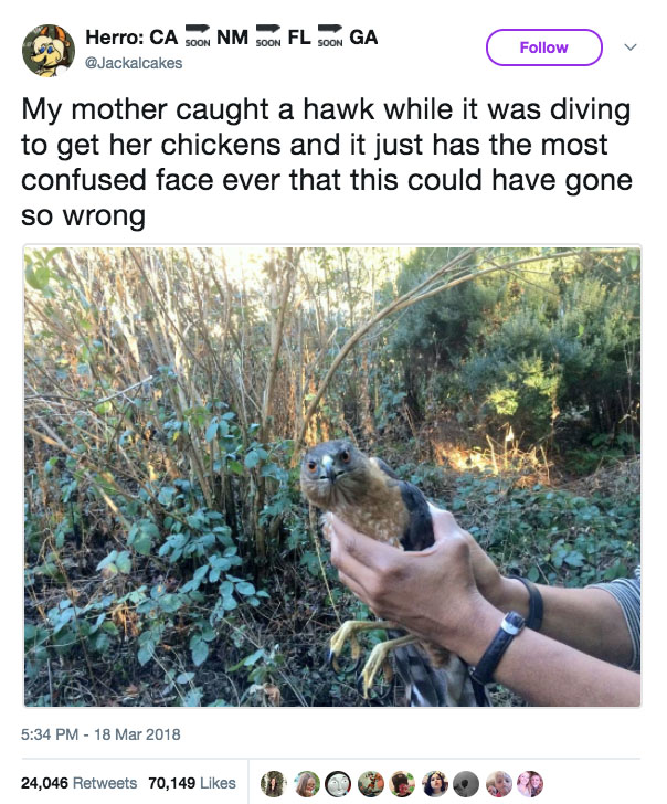 有只鹰正打算俯冲下来抓我妈养的鸡,被我妈在半空一把抓住。这简直是我见过的最懵逼的脸,就好像在说这是什么鬼