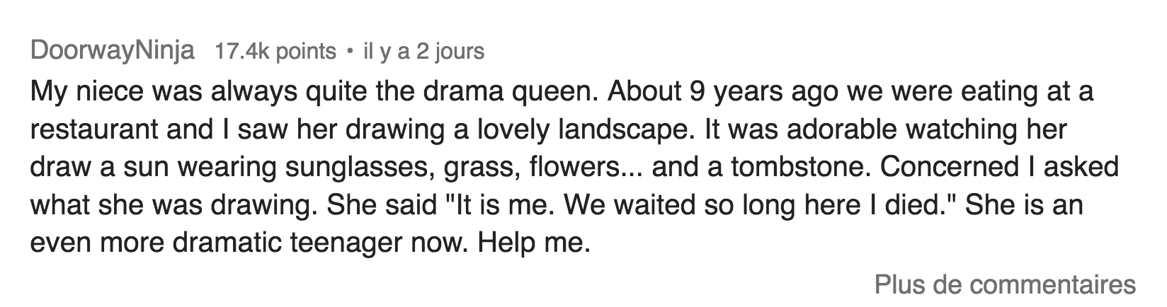 我侄女一直都特别抓马。她9岁的时候我们有一次去餐厅吃饭,我见她画了很可爱的风景画。就是那种萌萌的带墨镜的太阳公公,草呀花呀什么的……然后她画了个墓碑。