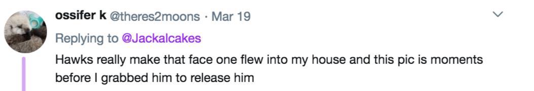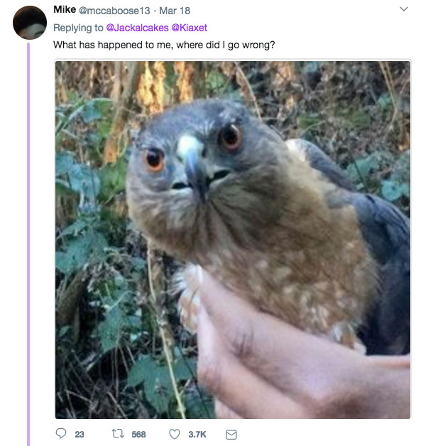 鹰真的会有这种表情,有一次我家里进了一只,这是我抓住他前一秒的时候他的表情