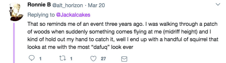 让我想起来好多年以前。我有天在林中小径上走着,结果有个什么东西直接朝我飞过来了(半身高吧),我伸手出去一抓,结果抓了满把的松鼠,我这辈子都没见过如此“wtf???”的表情出现在松鼠脸上