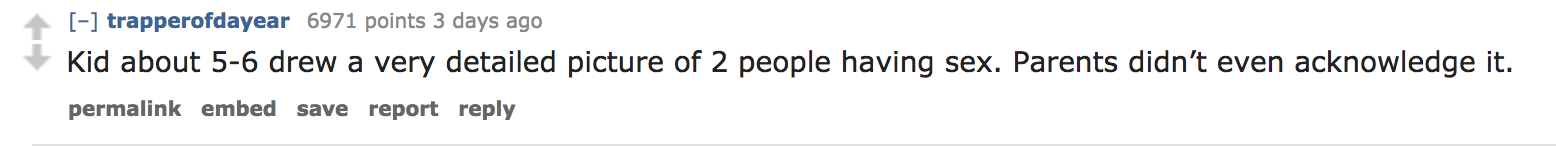 有个5、6岁的小孩画了一张非常详细的两个人上床的画。他父母都不愿意承认是他画的。