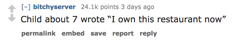 有个7岁小孩写的:“现在这家餐厅归我了”