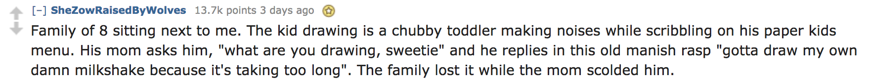有一家八口人在我旁边吃饭。他家胖胖的宝宝一边嘟嘟囔囔一边在儿童菜单上涂涂画画的。他妈妈就问他:“乖宝宝,你在画什么呀?”然后他就用一种极为老成的语气表示“奶昔半天都不来,我可不就要给自己画一个么。”全家人都笑爆只有他妈把他训了一通。