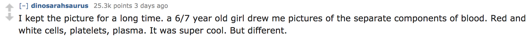 有幅画我一直留着。大概是个6、7岁的女孩画给我的,血液成分图,上面有白细胞、红细胞、血小板和血浆。我觉得超酷,就是有点跟其他人不一样。