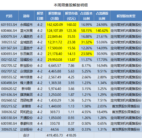 Wind数据显示,4月2日-4月4日共有19家公司限售股陆续解禁,合计解禁量41.95亿股,按3月30日收盘价计算,解禁市值为418.05亿元。