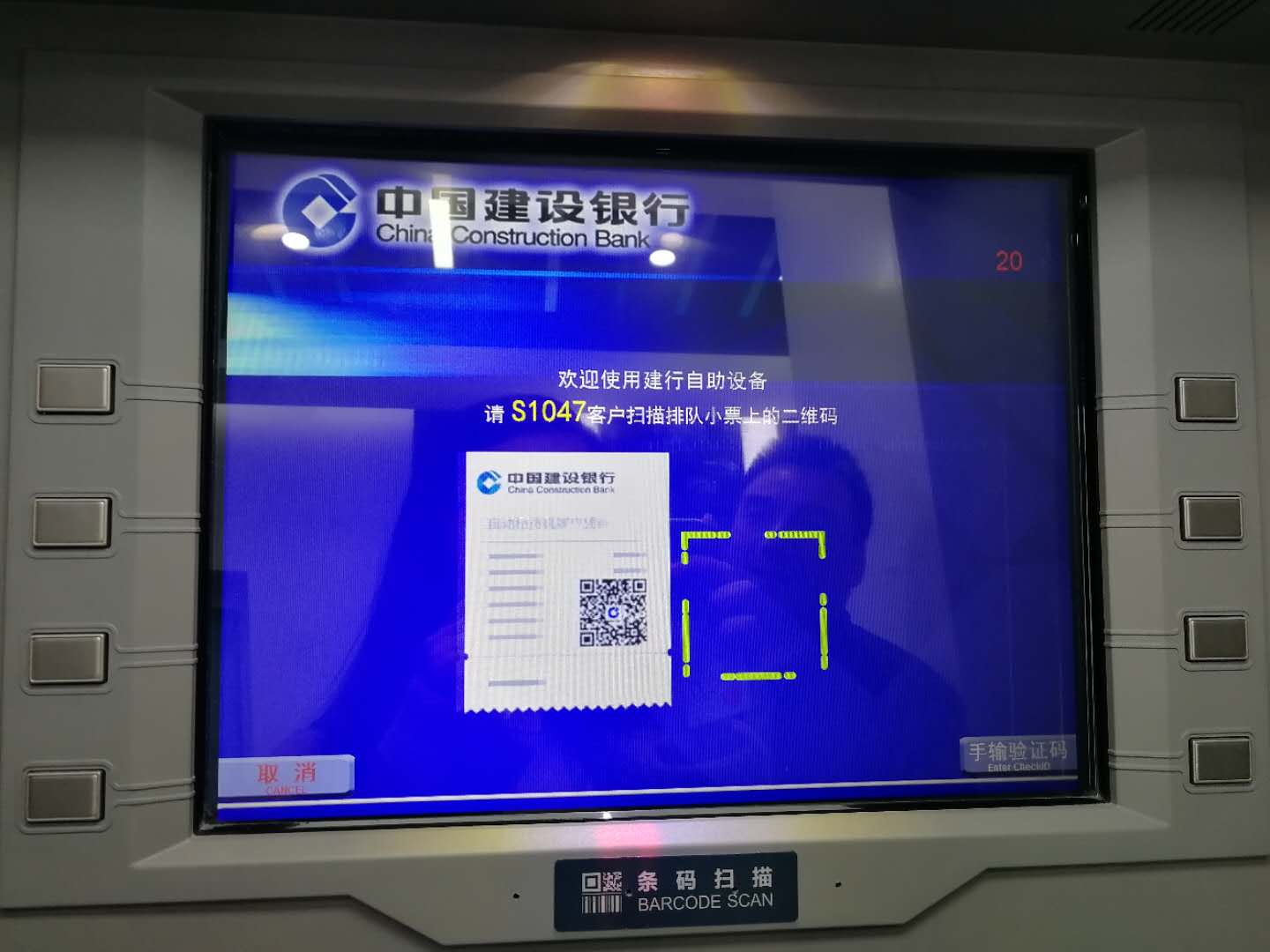 使用这些机器需要排队吗?记者在刚开始领取的办理存款与取现的号签在这时候派上了用场。存取款一体机播报到记者的号签码,记者将号签上的二维码放在下图中红光的位置识别后才能开始操作。这个功能类似于普通网点的取号排队,并无太多新颖之处。