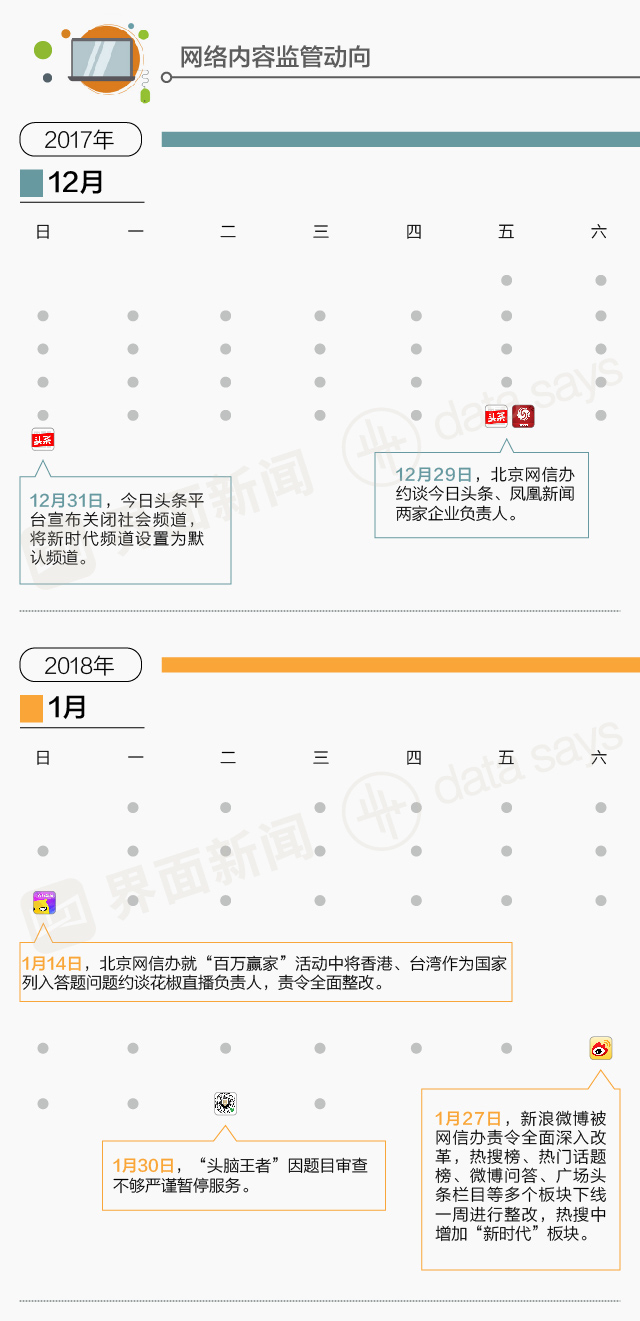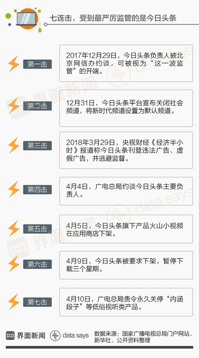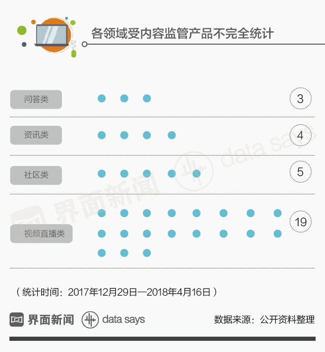 2017年年末,今日头条和凤凰新闻被北京网信办约谈,随后网络内容监管涉及资讯、问答、社区,以及短视频和直播等领域。据界面新闻记者不完全统计,截至2018年4月16日,内容监管最主要集中在视频直播类产品。