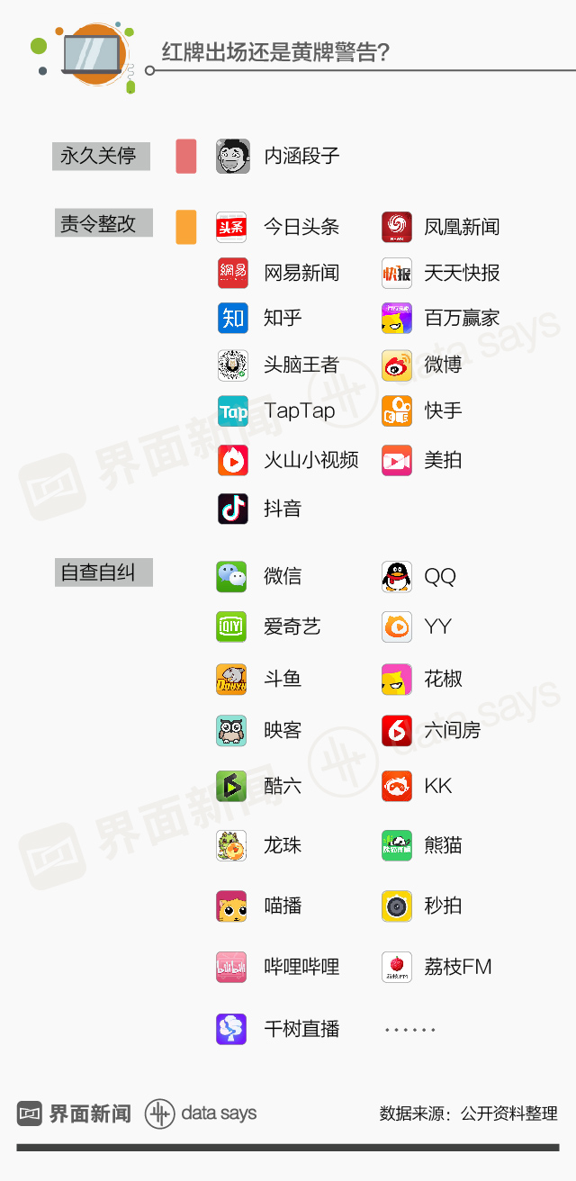 这波网络内容监管中,大部分产品被相关部门出示了黄牌,部分产品被罚以阶段性下架,另一部分将迎接不同程度内容整改。最严厉的处罚则属内涵段子,国家广电总局直接出示红牌,将其永久关停。不过,也有一些产品正积极自查自纠,进行自我整改。
