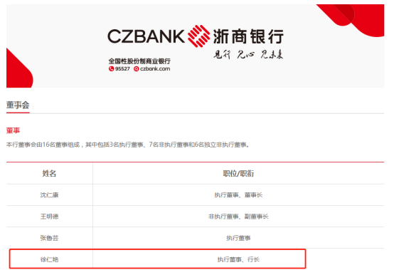 蓝鲸财经在浙商银行官网上获悉,目前网站公开的董事会成员名单中,已不见刘晓春的身影。取而代之的是任执行董事、行长的徐仁艳。