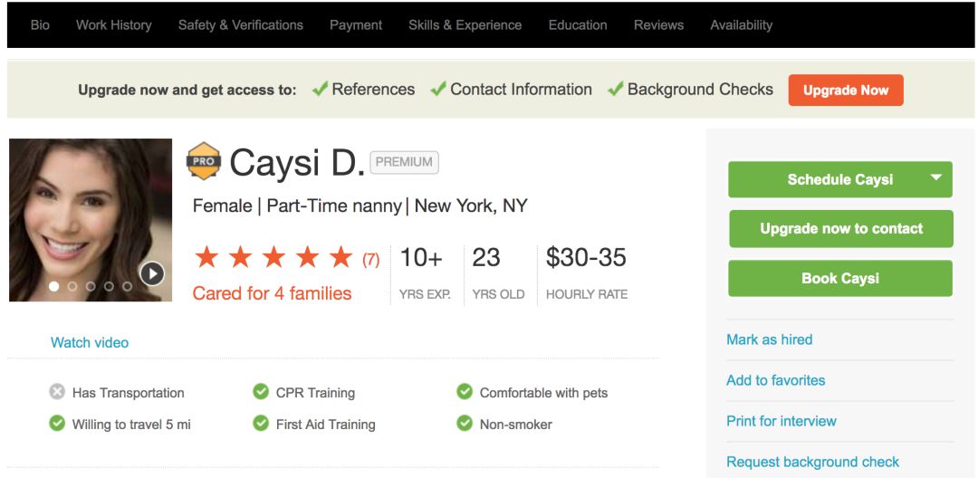 在Care.com上打开任意一个保姆的信息主页均可以看到其全部个性化信息,包括个人介绍、工作经验、职业技能、学历、认证、全职还是兼职、擅长领域、过往经历、服务内容、是否具有个人交通工具、工资、支付方式、联络方式、可选工作时段等。
