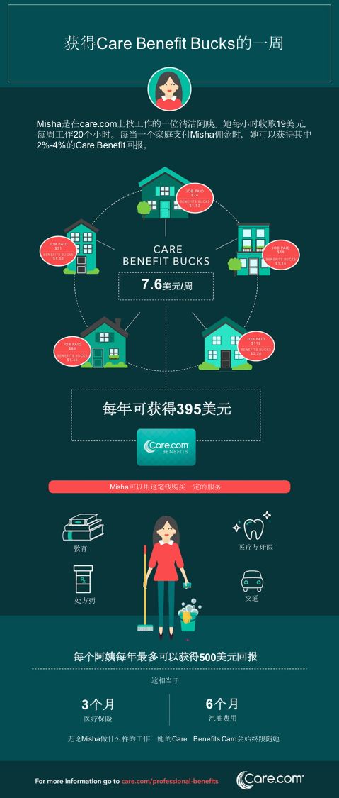 在此项目中,雇主每向阿姨支付一笔佣金,其中2%将会被打入阿姨的Care.com账户中,形成相应Care Benefit Bucks积分,雇主也可以选择多付。这部分金额完全来源于Care.com的手续费等杂费,不影响阿姨的实际收入。
