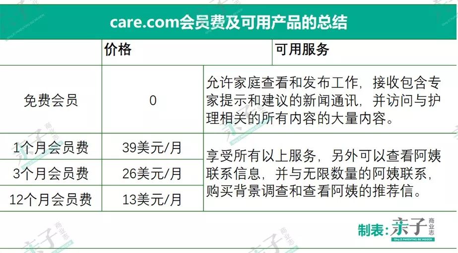 因此,Care.com选择了会员费模式,致力于最大程度地绑定客户。具体会资费标准及对应服务如下: