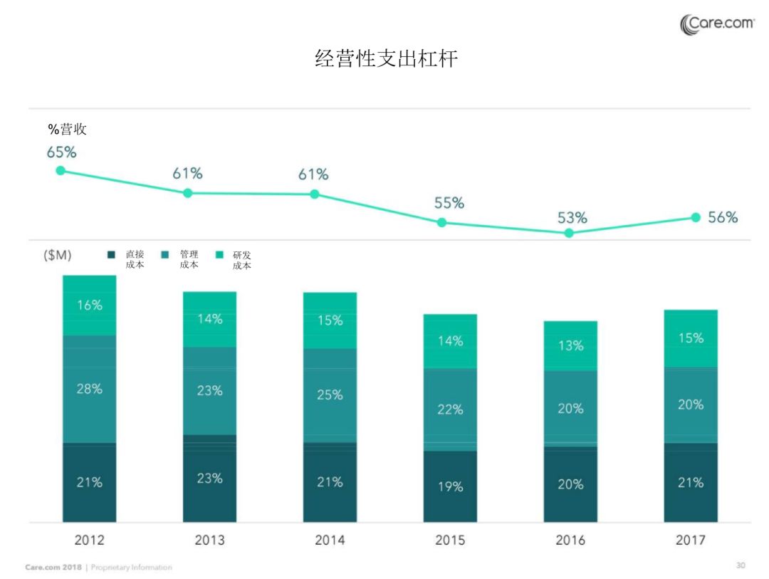 这主要得益于Care.com多年来在销售与市场上舍得烧钱以及强大的地推能力。2017年,Care.com花费在销售与市场营销上的成本达到6700万美元,占到总营收的38%。这依然是一个较高的比例,但相对过去5年而言已经明显有所下降。