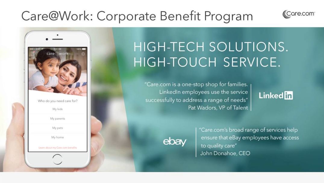 Care.com推出的Care@Work就是一个针对此类需求设置的产品。通过与各大企业的家庭护理计划达成合作,Care@Work允许他们的员工能以企业合同价获取Care.com的服务。