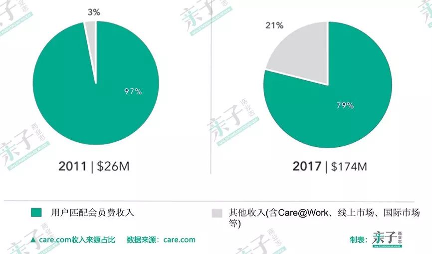 浏览Care.com官网可以感觉到,整个网页没有广告,Care.com也没有亲子服务或孕婴童产品等衍生业务收入。公司公开财务数据显示,尽管经过多年来对增值业务的经营,目前79%的营收依然来自匹配服务的会员付费收入,Care@Work及其他多个增值业务带来的收入仅占21%。