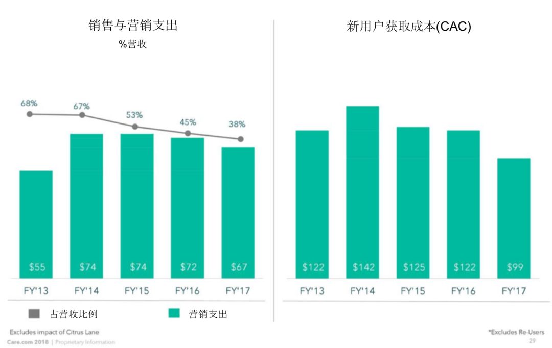由于对会员付费的严重依赖性,获取新用户是提高公司收入的关键环节。随着公司规模增长后,新用户的获取成本已经趋于下降趋势。2017年,Care.com获取新的付费用户的成本(CAC)已经由2011年的122美元下降到99美元,对比每位付费用户所贡献的价值461美元,Care.com实现了4.6倍ROI。