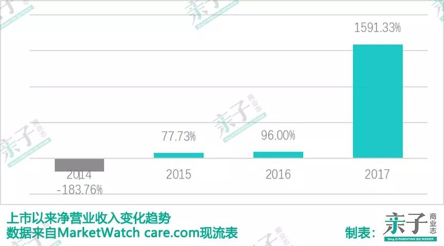 另一方面,Care.com在上市后净营业收入的增长十分迅猛,可见家政市场还远未触及天花板。 财务数据显示,净营业收入在2015年、2016年及2017年三年的增长率分别为77.73%,96%与1591.33%。