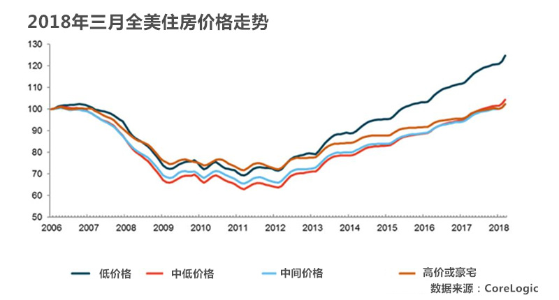 上图显示各个不同“段位”的房屋价值从2006年1月起的变化情况,不难发现,低价房屋从2013年开始价格涨幅要明显领先于其他类型,此后也一直保持稳定。如果将视野拉长至五年(2013年3月至2018年3月),低价房屋在五年里升值率为55%。尽管涨幅无法和中国房产市场相提并论,但就其历史水平而言,已经是高涨幅。