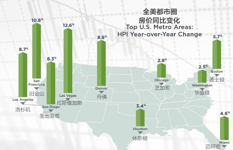 从地域上来看,3月份,全美50个州的房屋价格均出现正增长。华盛顿和内华达州表现要高于全国水平,年增长达12.6%。爱达荷州和犹他州紧随其后,分别同比增长12.3%和11.2%。有些情况不太乐观,报告发现,全美37州的房屋价格上涨超过危机前的峰值水平。另外,在城市圈中,拉斯维加斯的房价涨幅最大,为12.6%,其次是旧金山(10.8%)和丹佛(8.9%)。