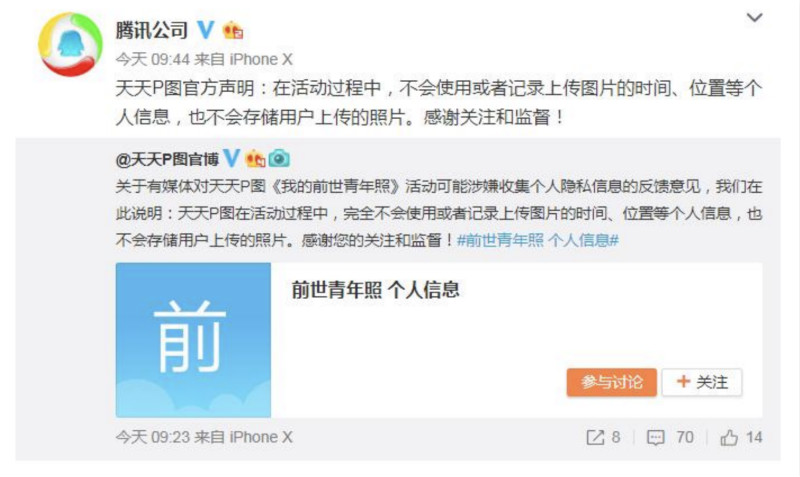 今年五四青年节期间旗下天天P图的“我的前世青年照”活动在网络刷屏,但有网友质疑该活动涉嫌个人隐私信息收集的消息。今日,天天P图和腾讯官方回应称,天天P图在活动过程中,完全不会使用或者记录上传图片的时间、位置等个人信息,也不会存储用户上传的照片。