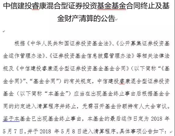 中信建投宣布,中信建投睿康混合型基金合同终止及基金财产清算,而该基金的最后运作日定为2018年5月7日,并于2018 年5月8日进入清算程序。