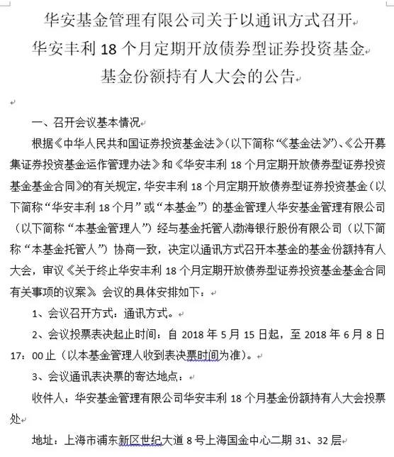 同时,华安基金也宣布,以通讯方式召开华安丰利18个月定期开放债券型基金持有人大会,正是讨论终止该基金合同有关事项的议案。